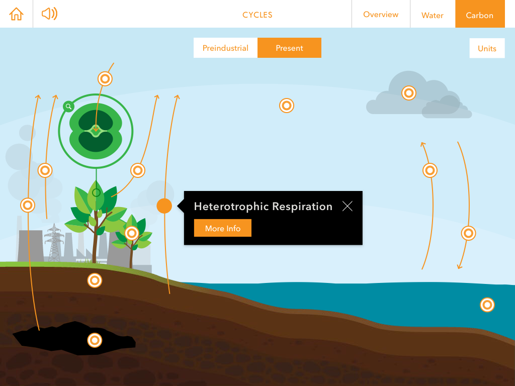 In the carbon and water cycle charts, students can click on each element for more information, including useful links to external websites. There is also connections to climate change, so students can explore how rising temperatures have impacted the carbon and water cycles since the industrial revolution.